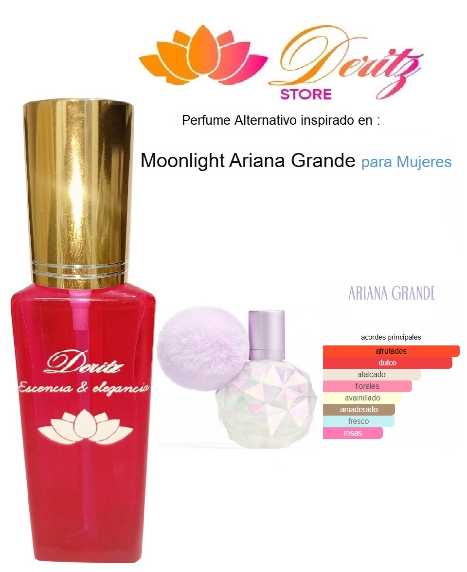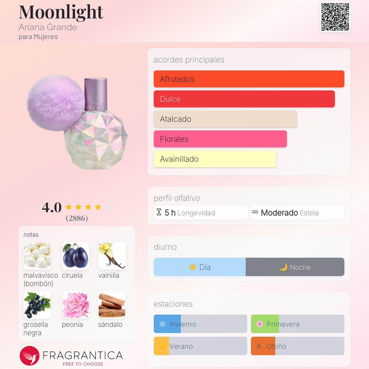 Moonlight de Ariana Grande es una fragancia de la familia olfativa Floral Frutal para Mujeres. Moonlight se lanzó en 2017. Las Notas de Salida son ciruela y grosellas negras; las Notas de Corazón son malvavisco (bombón) y peonía; las Notas de Fondo son vainilla, sándalo y ámbar.