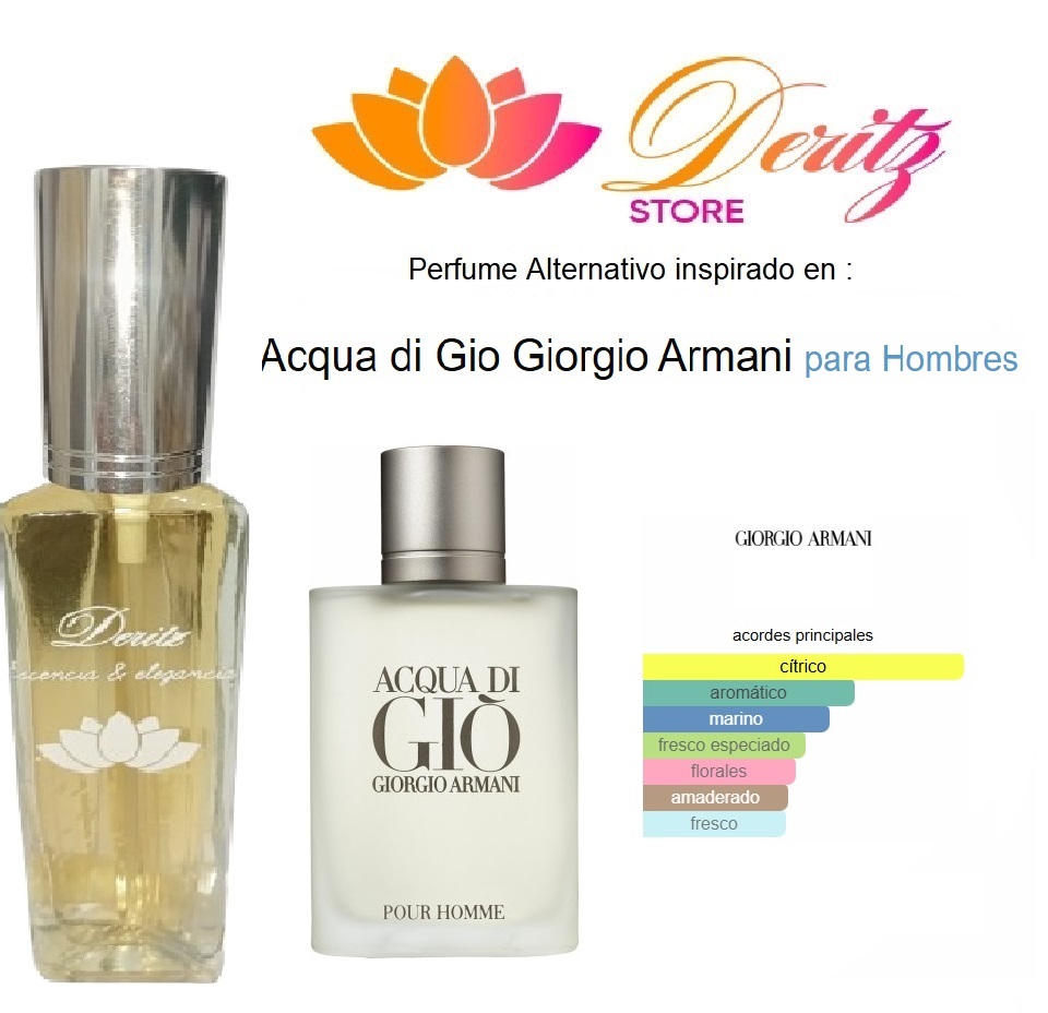 Acqua di Gio de Giorgio Armani es una fragancia de la familia olfativa Aromática Acuática para Hombres. Acqua di Gio se lanzó en 1996. Acqua di Gio fue creada por Alberto Morillas, Annick Menardo y Christian Dussoulier. Las Notas de Salida son lima (limón verde), limón (lima ácida), bergamota, jazmín, naranja, mandarina y neroli; las Notas de Corazón son notas marinas, jazmín, calone, romero, durazno (melocotón), fresia, jacinto, ciclamen (violeta persa), violeta, cilantro, rosa, nuez moscada y reseda (miñoneta); las Notas de Fondo son almizcle blanco, cedro, musgo de roble, pachulí y ámbar.