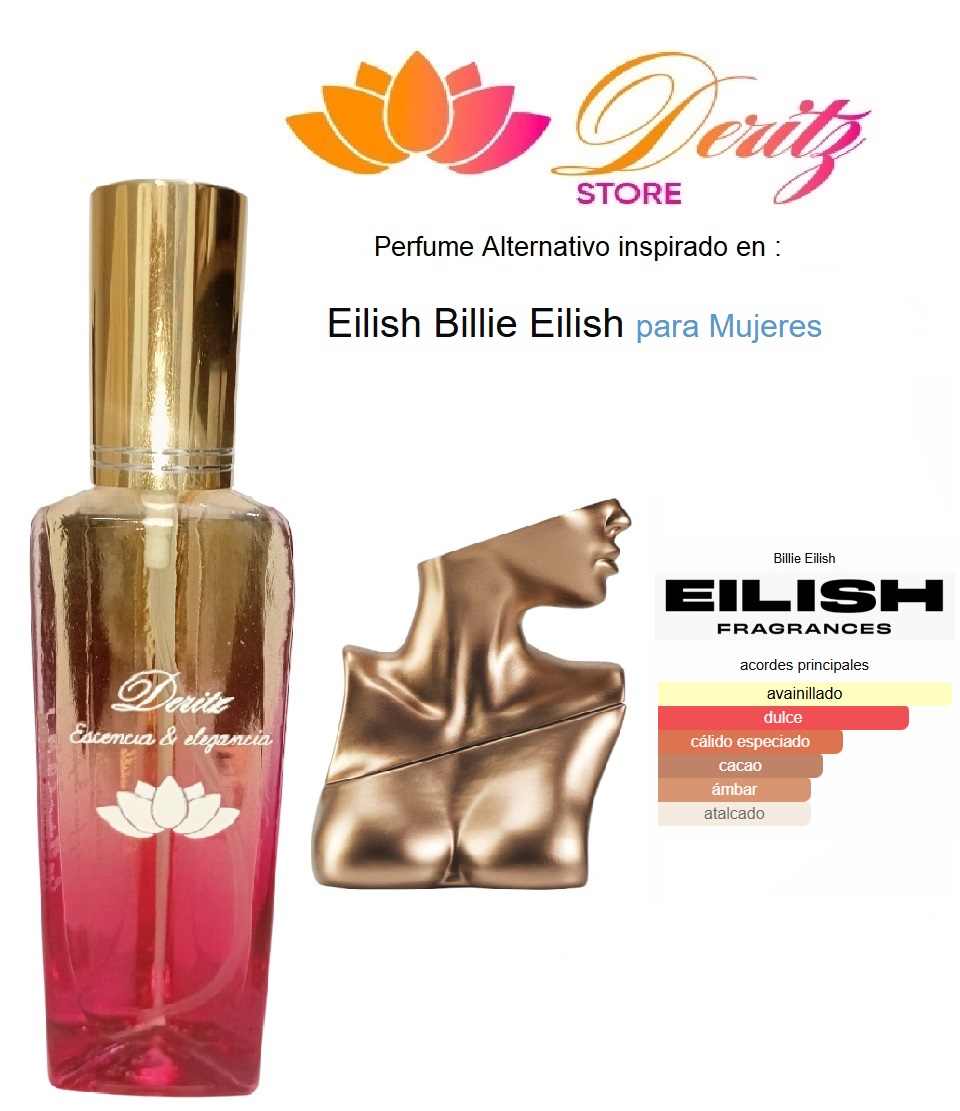 Eilish de Billie Eilish es una fragancia de la familia olfativa Oriental Vainilla para Mujeres. Eilish se lanzó en 2021. La Nariz detrás de esta fragrancia es Steve DeMercado. Las Notas de Salida son azúcar, bayas rojas y mandarina; las Notas de Corazón son vainilla, cacao, notas especiadas y rosa; las Notas de Fondo son haba tonka, ámbar, almizcle y notas amaderadas.