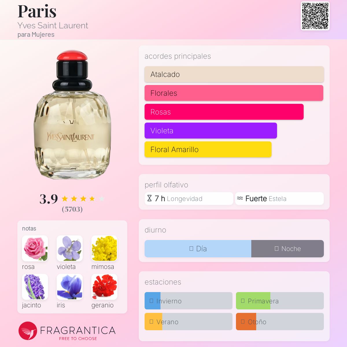 Paris de Yves Saint Laurent es una fragancia de la familia olfativa Floral para Mujeres. Paris se lanzó en 1983. La Nariz detrás de esta fragrancia es Sophia Grojsman. Las Notas de Salida son rosa, mimosa, jacinto, geranio, notas verdes, flor de azahar del naranjo, capuchina, flor del espino, casia y bergamota; las Notas de Corazón son rosa, violeta, azucena, flor de azahar del limero, ylang-ylang, lirio de los valles (muguete), jazmín y raíz de lirio; las Notas de Fondo son iris, almizcle, heliotropo, sándalo, musgo de roble, ámbar y cedro.