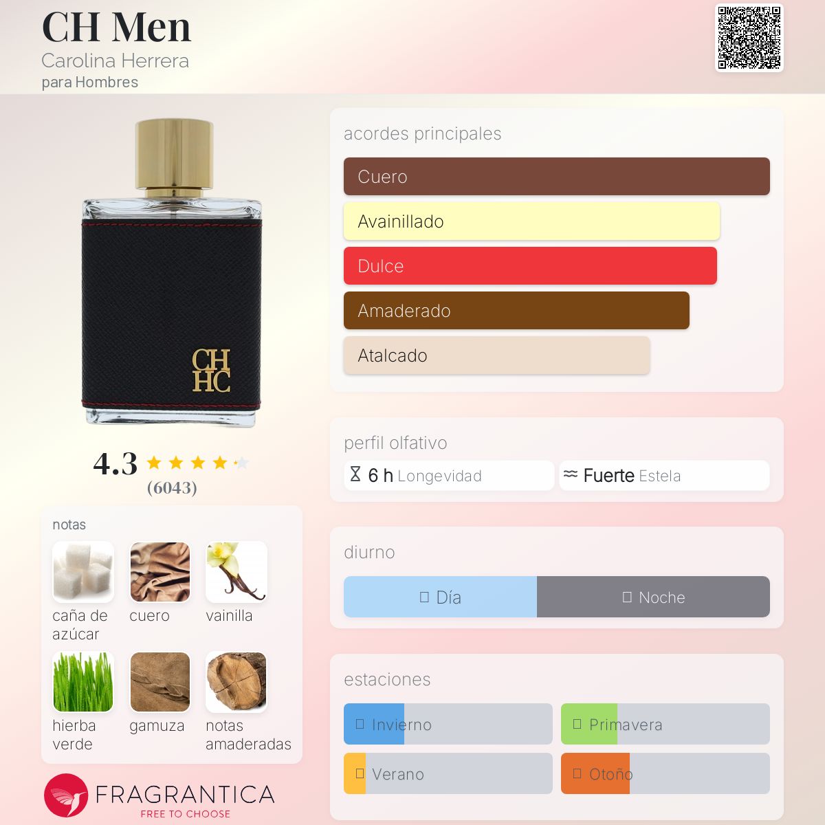CH Men de Carolina Herrera es una fragancia de la familia olfativa Oriental Especiada para Hombres. CH Men se lanzó en 2009. Las Notas de Salida son hierba, bergamota y toronja (pomelo); las Notas de Corazón son notas amaderadas, nuez moscada, violeta, azafrán y jazmín; las Notas de Fondo son azúcar, cuero, vainilla, gamuza, ámbar, madera de cachemira, sándalo, musgo de roble y vetiver.