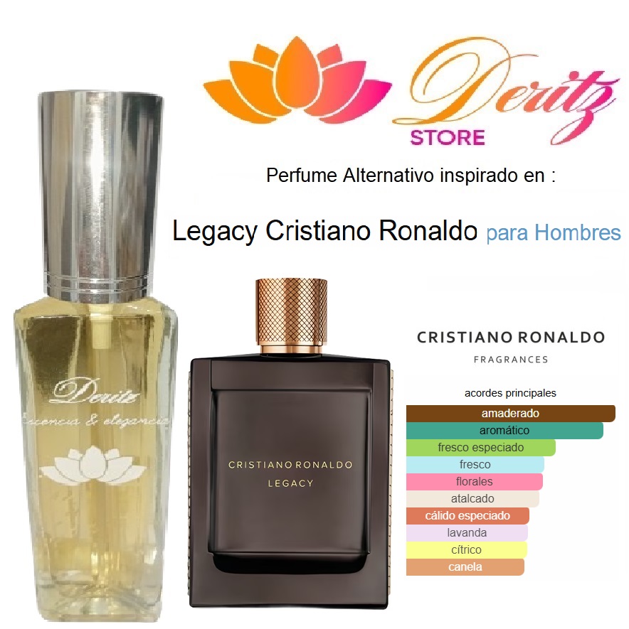 Legacy de Cristiano Ronaldo es una fragancia de la familia olfativa Amaderada Aromática para Hombres. Legacy se lanzó en 2015. Las Notas de Salida son manzana verde, lavanda, bergamota y canela; las Notas de Corazón son cedro, violeta, peonía, romero, salvia y raíz de lirio; las Notas de Fondo son ámbar gris, pachulí y vetiver.