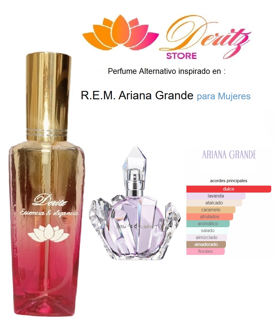R.E.M. de Ariana Grande es una fragancia de la familia olfativa Oriental Vainilla para Mujeres. R.E.M. se lanzó en 2020. La Nariz detrás de esta fragrancia es Alexis Grugeon. Las Notas de Salida son Zéfiro, caramelo, sal, higo y membrillo; las Notas de Corazón son lavanda y flor del peral; las Notas de Fondo son almizcle, haba tonka y sándalo.